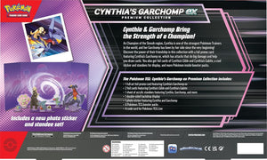 - The Pokémon TCG: Cynthia’s Garchomp ex Premium Collection includes 1 full-art foil promo card featuring Cynthia’s Garchomp ex and 2 foil cards featuring Cynthia’s Gible and Cynthia’s Gabite.