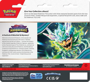 - Contains 3 booster packs from Pokémon TCG: Scarlet & Violet—Twilight Masquerade. (Each booster pack contains 10 game cards and 1 Basic Energy. Cards vary by pack.)